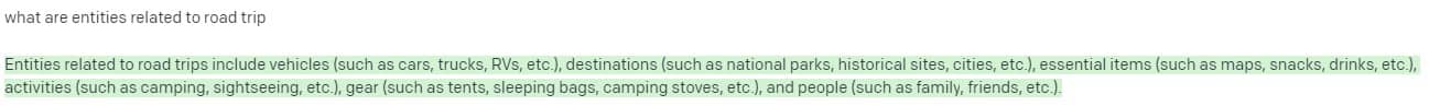 - Identifying popular topics and related entities and keywords that are being searched for. I asked the bot to list some topics related to road trips and it returned ideas as follows: