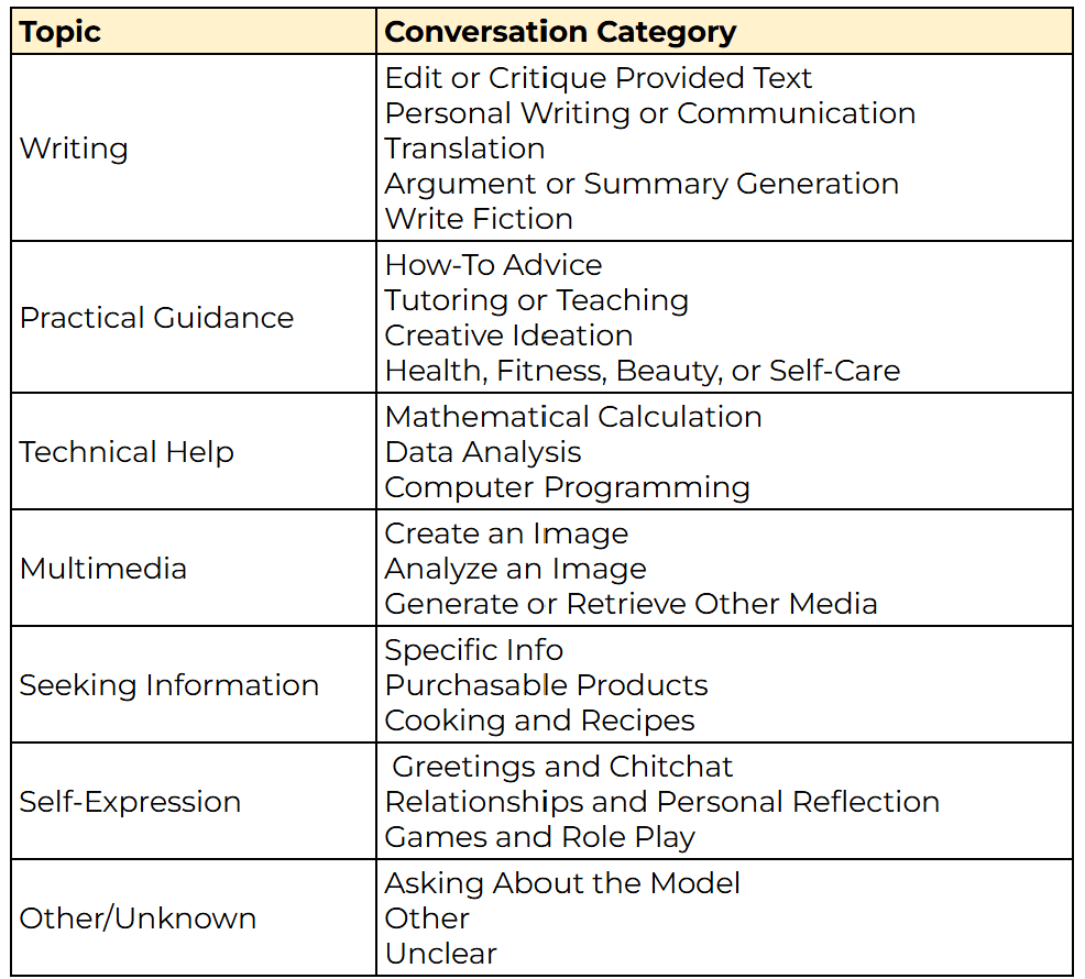 To understand how people use Chatgpt, Open AI developed a conversation classifier to bucket conversation into one of the following categories: