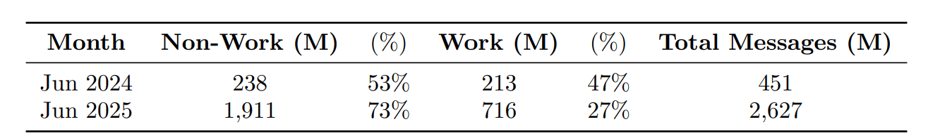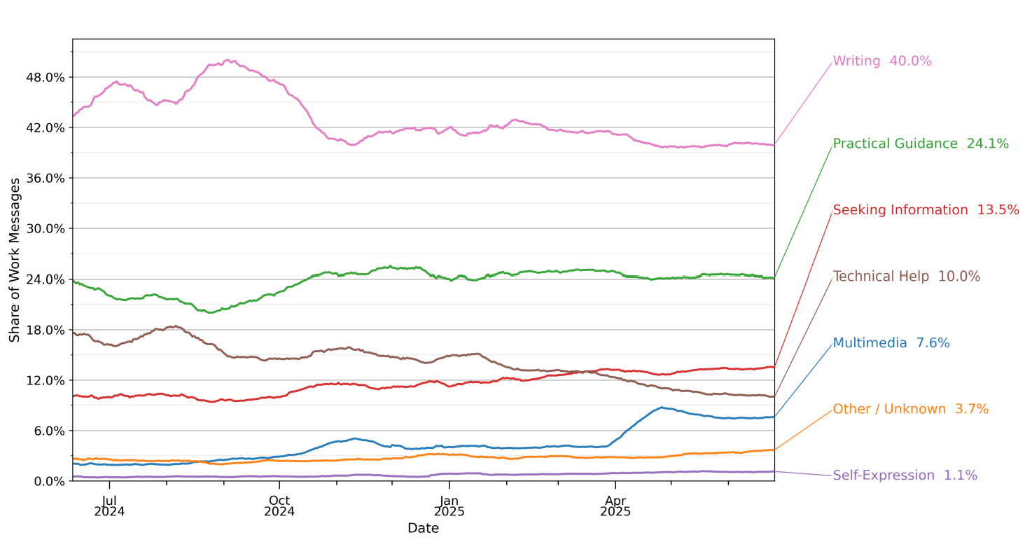 The study shows that writing is the #1 use case at work making up 40% of work-related ChatGPT messages in June 2025.