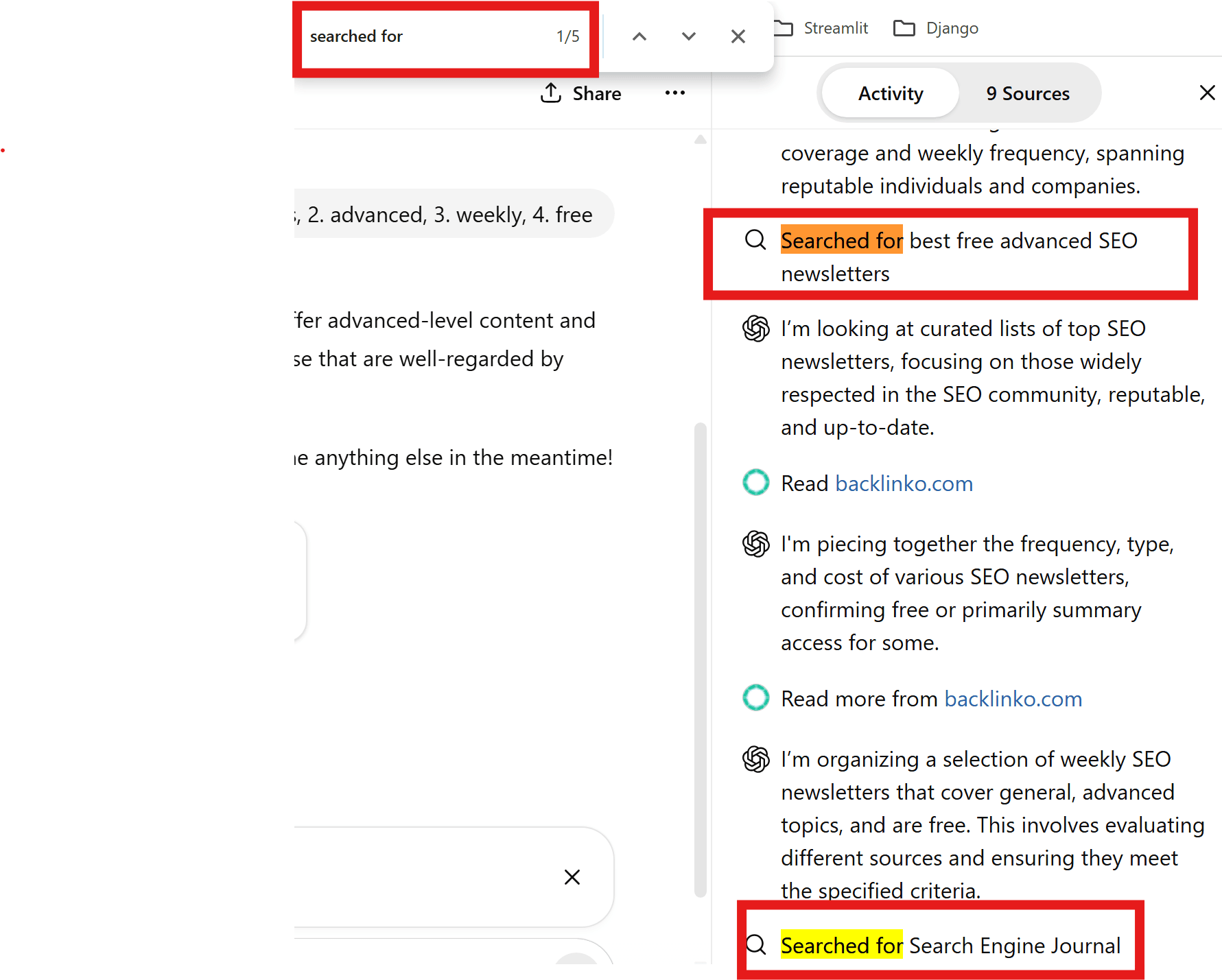 Once it's done, search for "searched for" to see how those refinement questions resulted in few "query fan out" searches.
