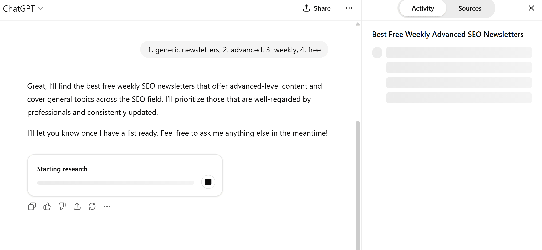 I went ahead and provided answers to the refinement questions for "best SEO newsletters". Once you do, you'll see a tab on the right, the "activity" tab.