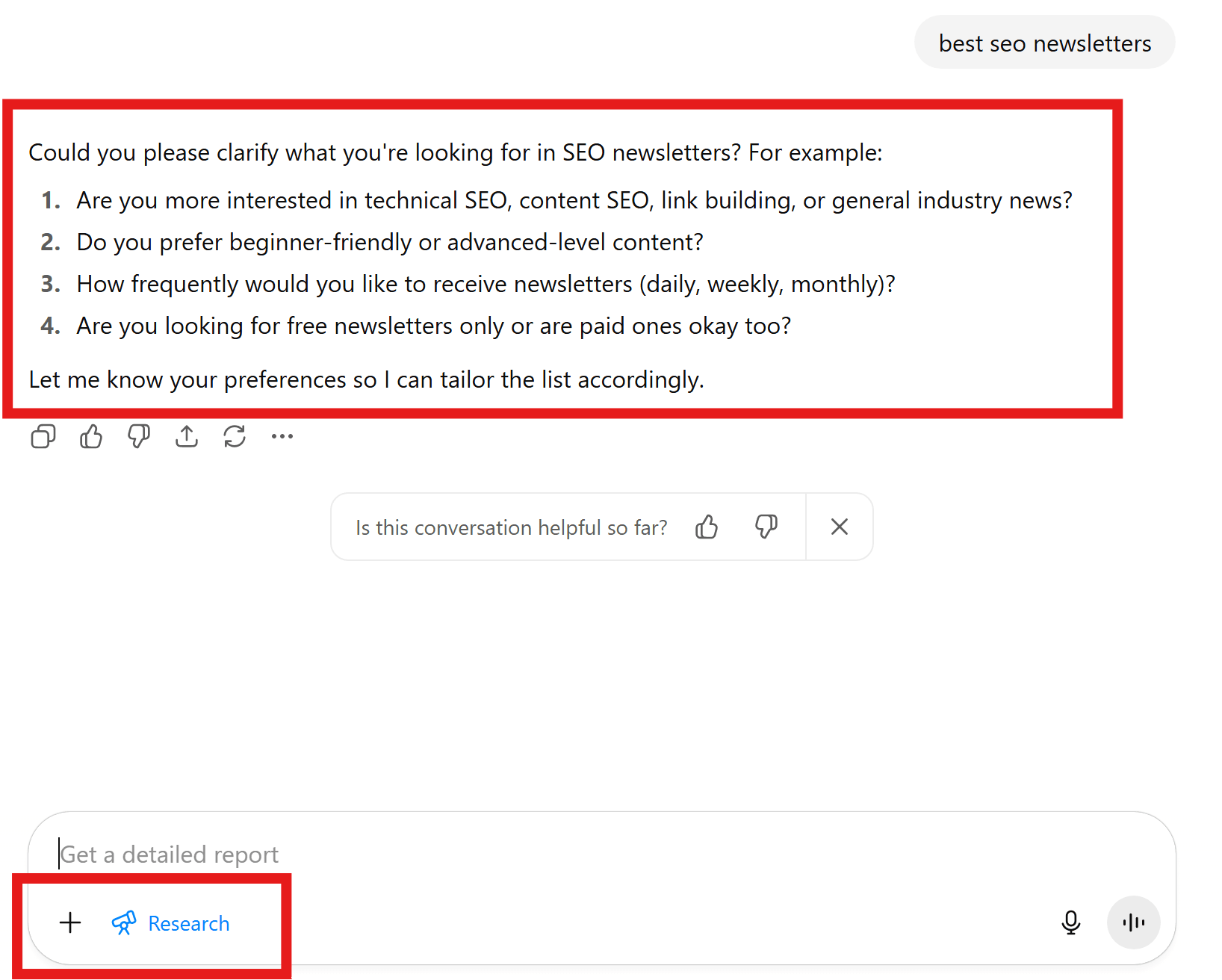 "ChatGPT Deep Research gives asks up follow-up questions after the initial query. Optimizing for these refinements ensures your content answers these likely subsequent questions, maintaining visibility in the conversation"