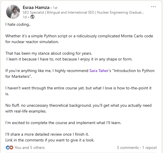 Reviews for the Python for SEO course!