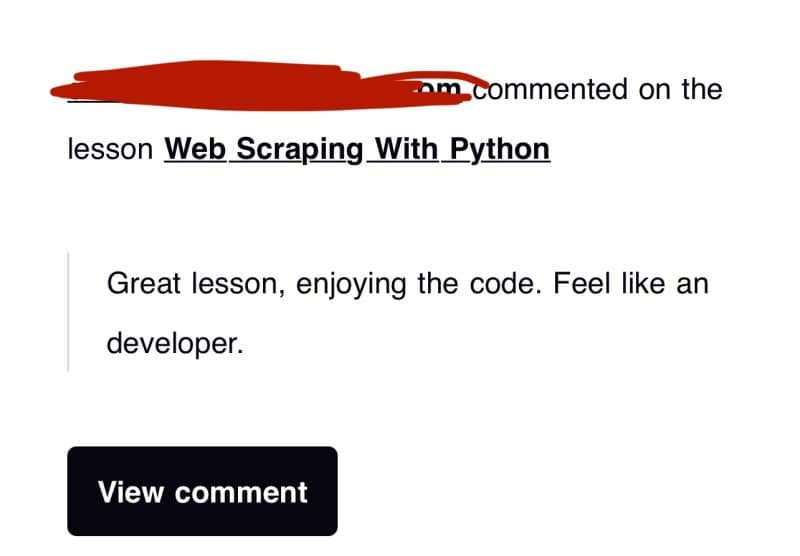 - "Great lesson, enjoying the code. Feel like an developer."