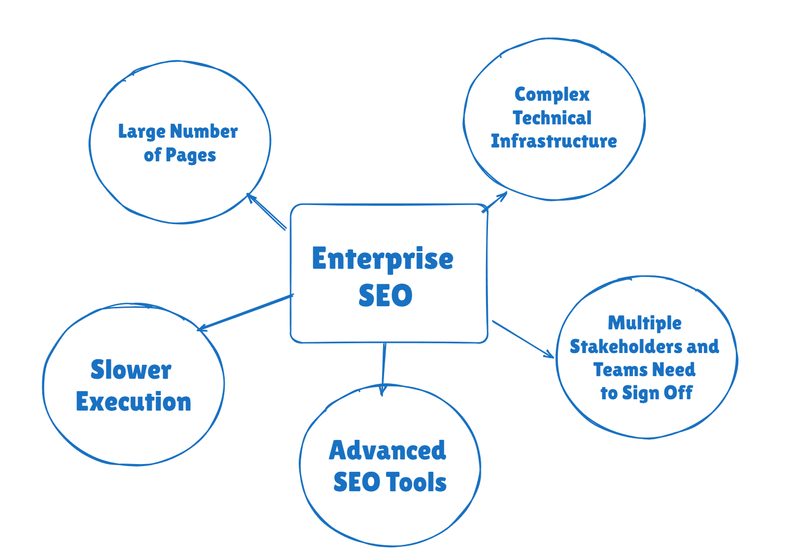 Enterprise SEO is a large-scale strategic approach to optimize websites with thousands to millions of pages for search. It involves tackling of complex technical infrastructure and content at scale. Additionally enterprise SEO requires cross-functional collaboration and usually advanced SEO tools.