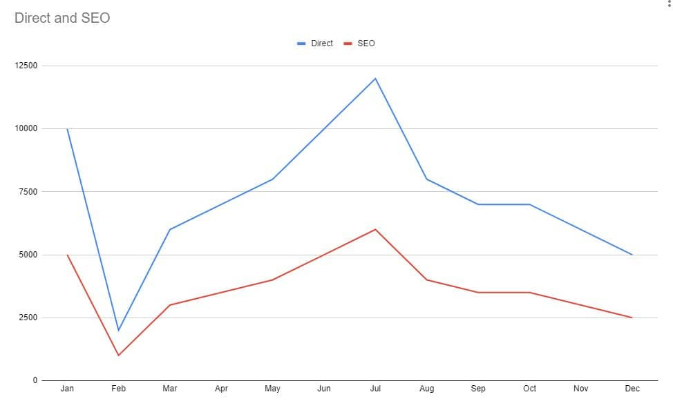 Last but not least my favorite example, direct traffic vs organic clicks. You can show the direct impact and relationship between your direct traffic which often goes unattributed to specific marketing efforts, to your SEO work, if your graph looks like this (do you see how they go hand in hand with absolute harmony?)