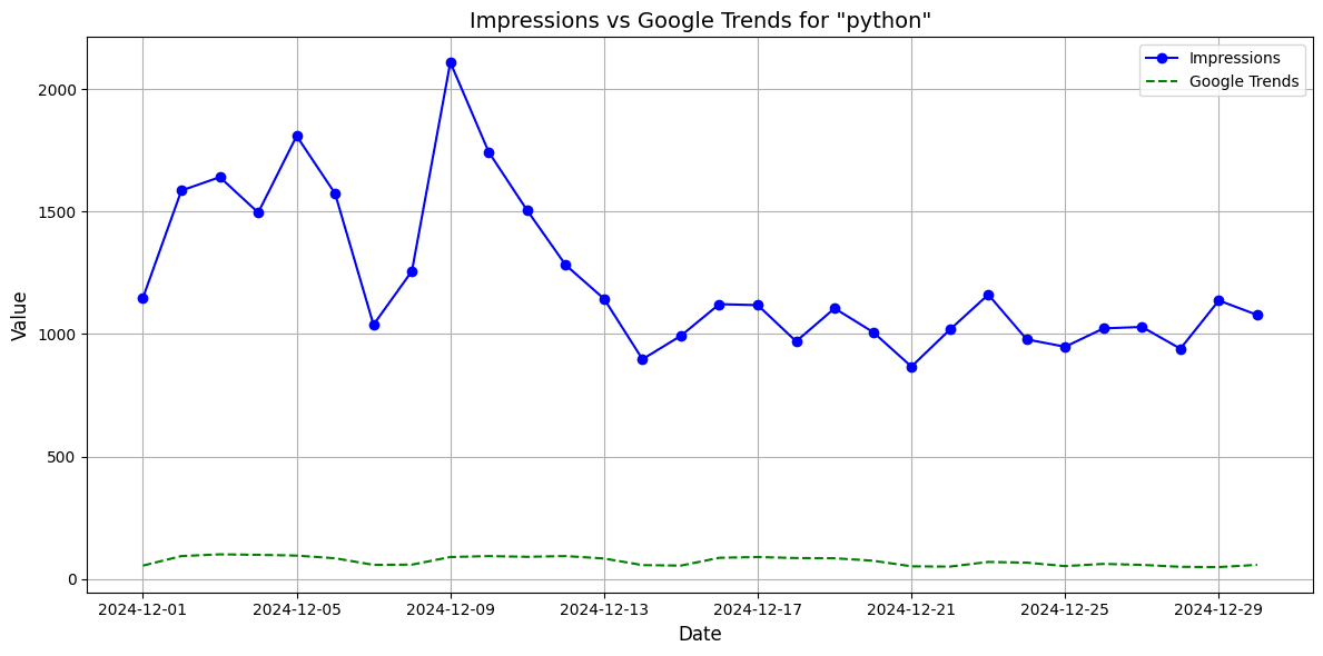 For the same period, plot 2 different metrics, clicks and sessions for the same time period for example or clicks and trends from Google trends. I have this graph from my Build Your Own SEO Tools (with Python & Agentic AI) course, where I compare impressions of my website (make that clicks starting today) with the search interest from Google trends for the keyword “Python”.
