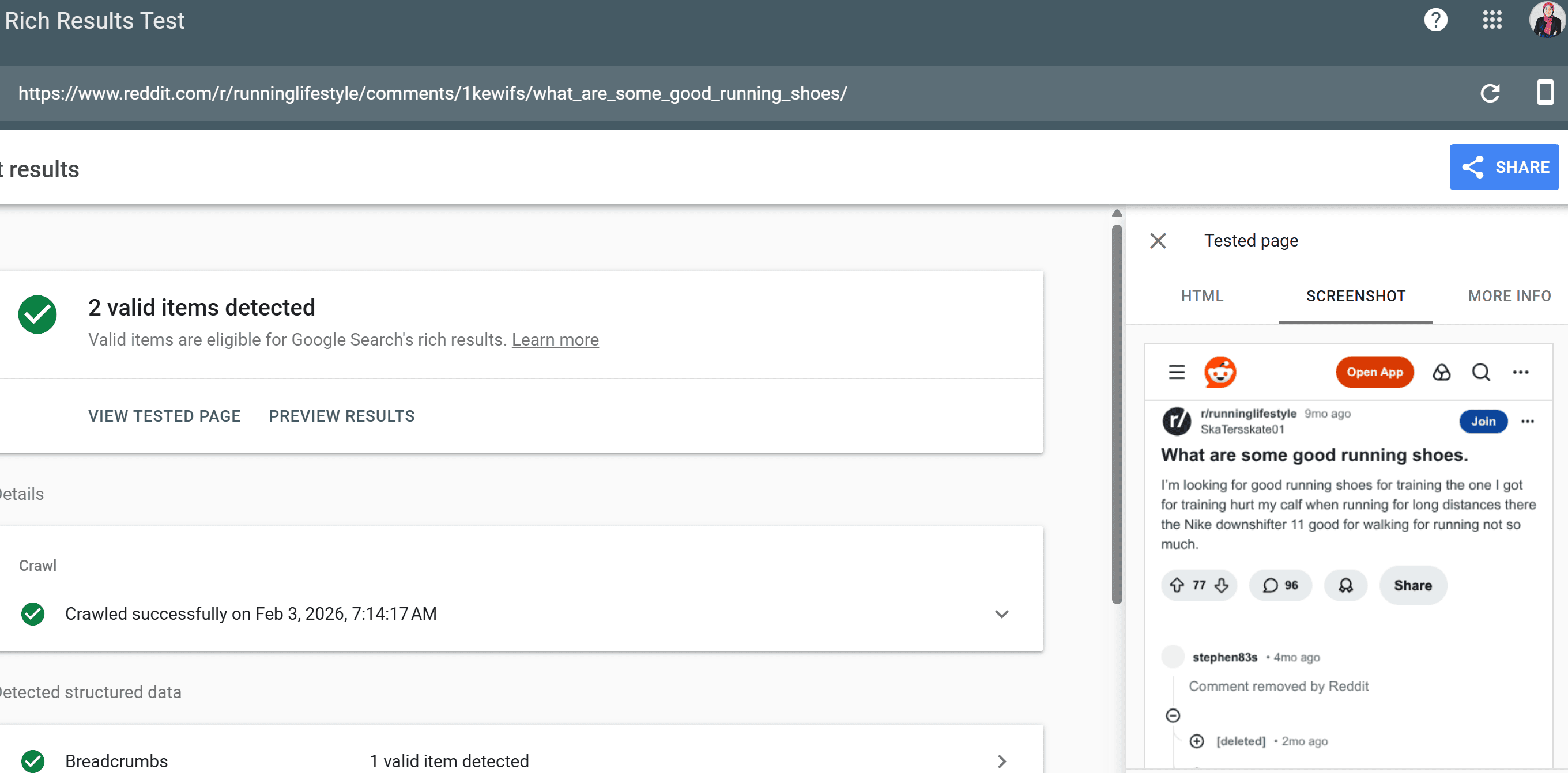 I also plugged the reddit URL into the rich results test tool and then clicked on “VIEW TESTED PAGE”, and ya Google can read the comments on the page with no issues whatsoever.