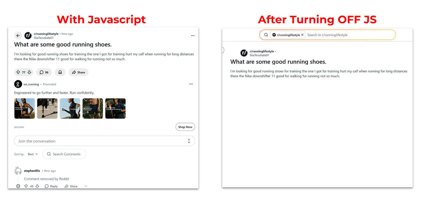 As a curious SEO, I was looking at some of the technical SEO issue on reddit and how are they handled. And of course JavaScript comes to mind. Did a simple JavaScript audit by turning off JS on the page and reloading it.